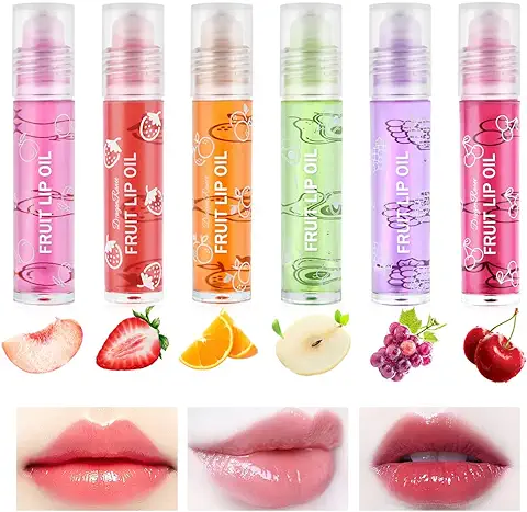 6 Pcs Hydrating Lip Oil Set, Fruit-Flavoured Plumping Lip Oil, Long Lasting Lip Glow Balm Lip Care, Transparent Moisturizing No-Sticky Lip Gloss(Peaches, Orange, Avocado, Strawberry, Grape, Cherry)